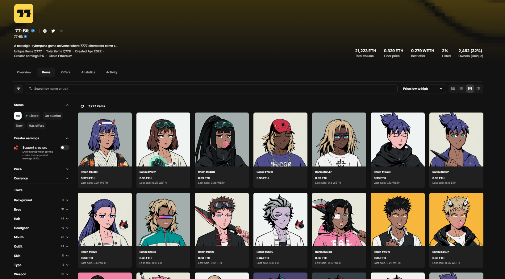 Access to the Beta depends on how deep someone is in the 77-Bit ecosystem. NFT holders are the first in, starting March 19. Holding one of the 77-Bit NFTs, known as Ronins, unlocks early entry along with a free Battle Pass, exclusive in-game items, and Boost multipliers. Right now, a Ronin NFT is priced at 0.329 ETH ($632.08).