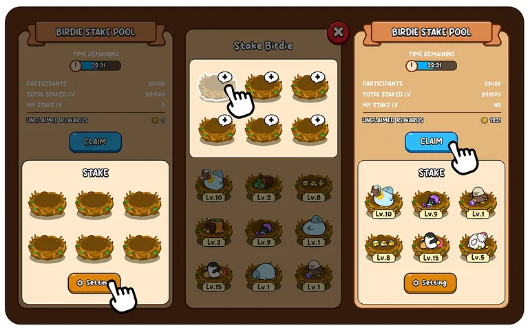 - Birdie Staking: Register up to 6 Birdies in the collection. The value is based on their total level, and $winG is awarded accordingly.