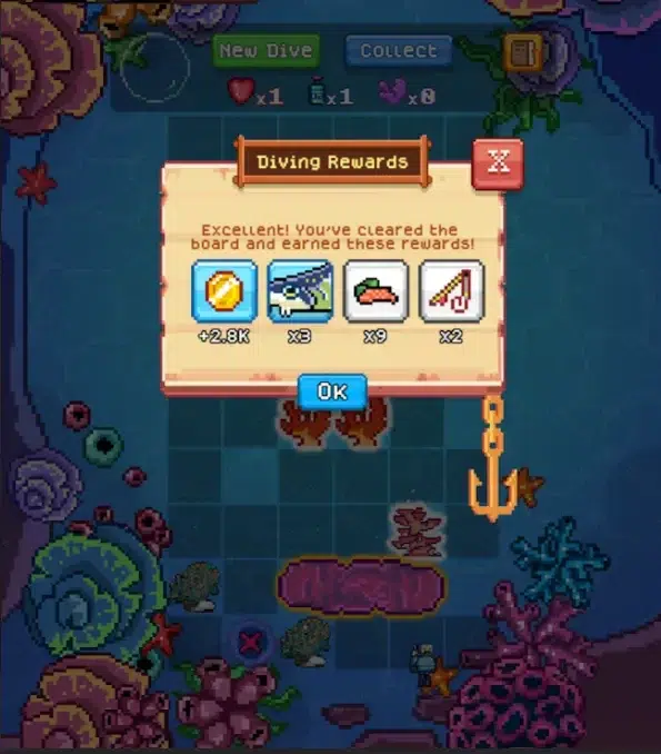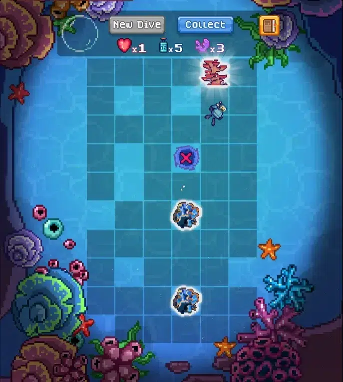 Each dive presents a board of tiles containing hidden corals and whirlpools. Revealing a full coral formation leads to rewards, while whirlpools reduce lives. All dives start with two lives. When both are lost, the run ends with no rewards.