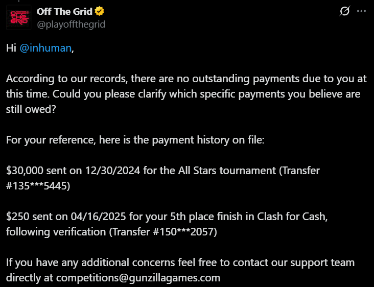Gunzilla didn’t stay silent. The official Off The Grid X account responded directly to inhuman’s post, stating that their records showed two completed payments—$30,000 and $250—for tournament finishes. They asked him to specify what was missing. Other players came forward to confirm they had, in fact, been paid. One user, 1vs3_Joker, reported a $39,000 payout processed in just one day, while ShazzV cited $24,000 received despite early KYC delays.