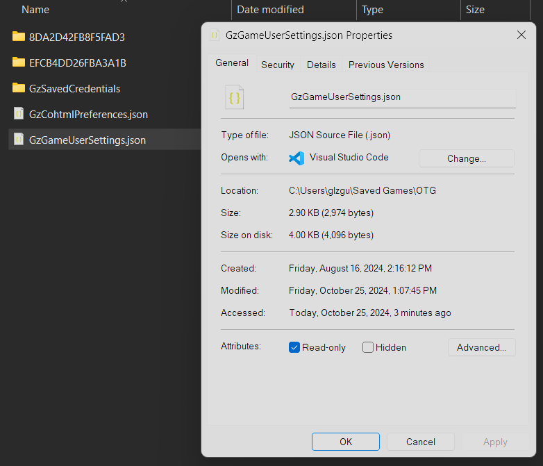 - Check the Read-only box, click Apply, and confirm with OK. This prevents the game from overriding your custom settings.