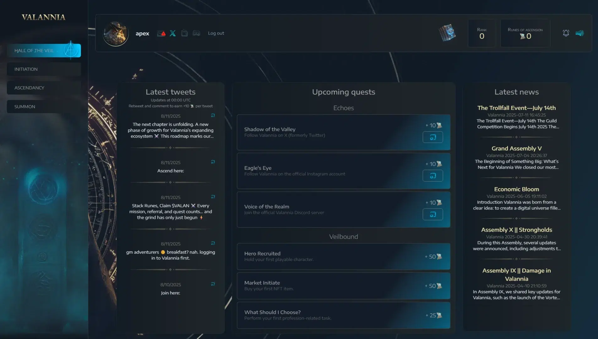 At the center of Shadow Veil is the Hall of the Veil, the main hub where Rune totals, rankings, featured posts, and current quests are displayed. Missions are split into Echoes, open to all players through community and social activities, and Veilbound, reserved for NFT holders and active participants in Valannia’s gameplay. A live leaderboard called Ascendancy keeps rankings up to date, while the Summon system tracks referrals and their contributions.
